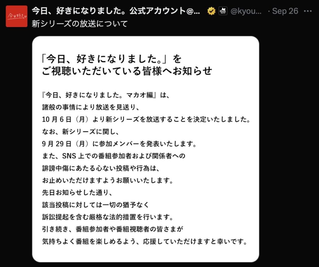 『今日、好きになりました。』マカオ編は、2025年9月15日から放送予定でしたが、残念ながらお蔵入りが決定しました。
